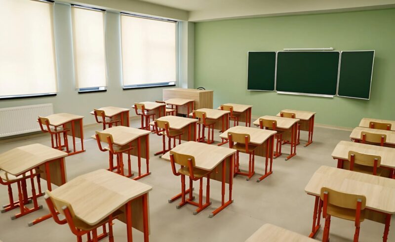 Die Morgensonne fiel in das Klassenzimmer der Mittelschule und spiegelte sich auf dem Boden. Das Kind saß ruhig an seinem Platz, zeichnete und wartete auf den Beginn des Unterrichts.